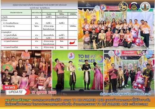 สำนักงานพัฒนาชุมชนอำเภอเมืองศรีสะเกษ ขอแสดงความยินดีกับ ชมรม TO BE NUMBER ONE ชุมชนบ้านหนองเทา ตำบลตะดอบ อำเภอเมืองศรีสะเกษ ในโอกาสที่ได้รับรางวัลดีเด่นระดับประเทศ ในการประกวดผลงานจังหวัด อำเภอ และชมรม TO BE NUMBER ONE ระดับประเทศ ประจำปี 2568